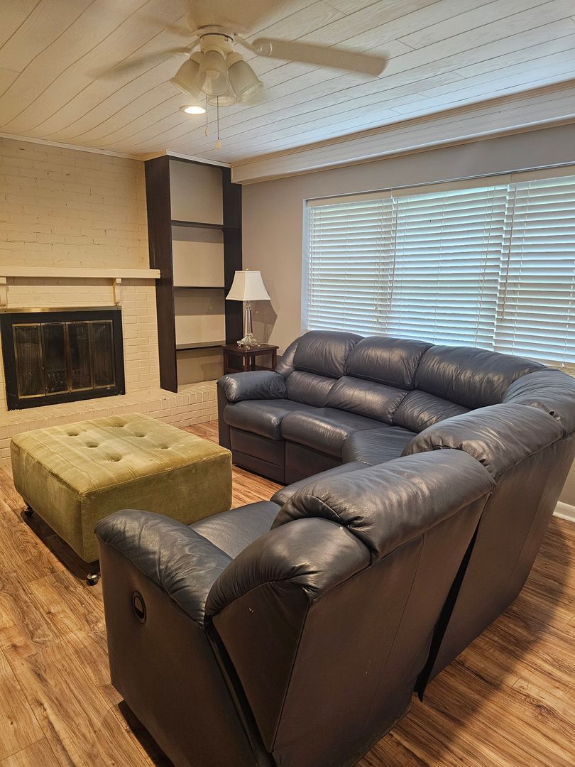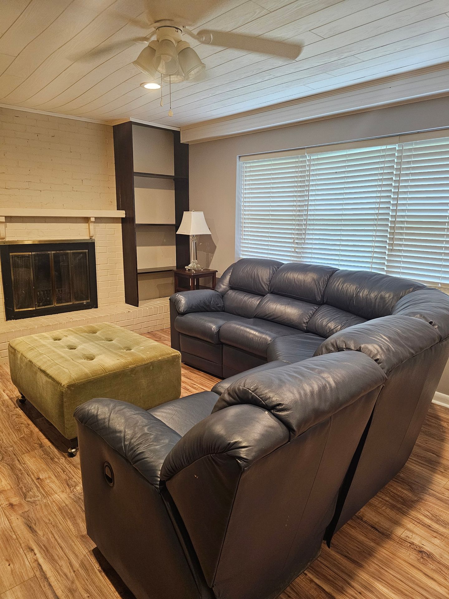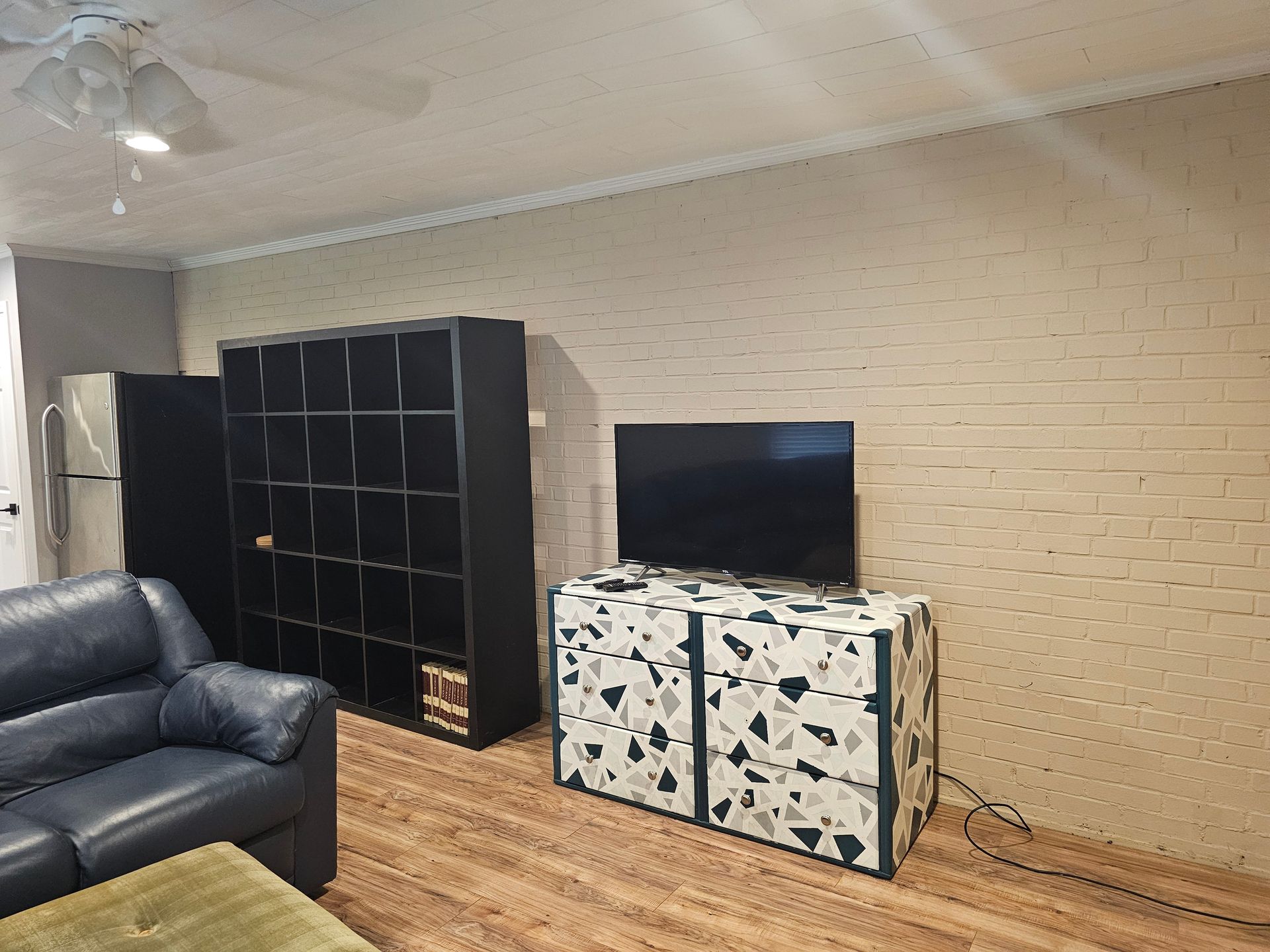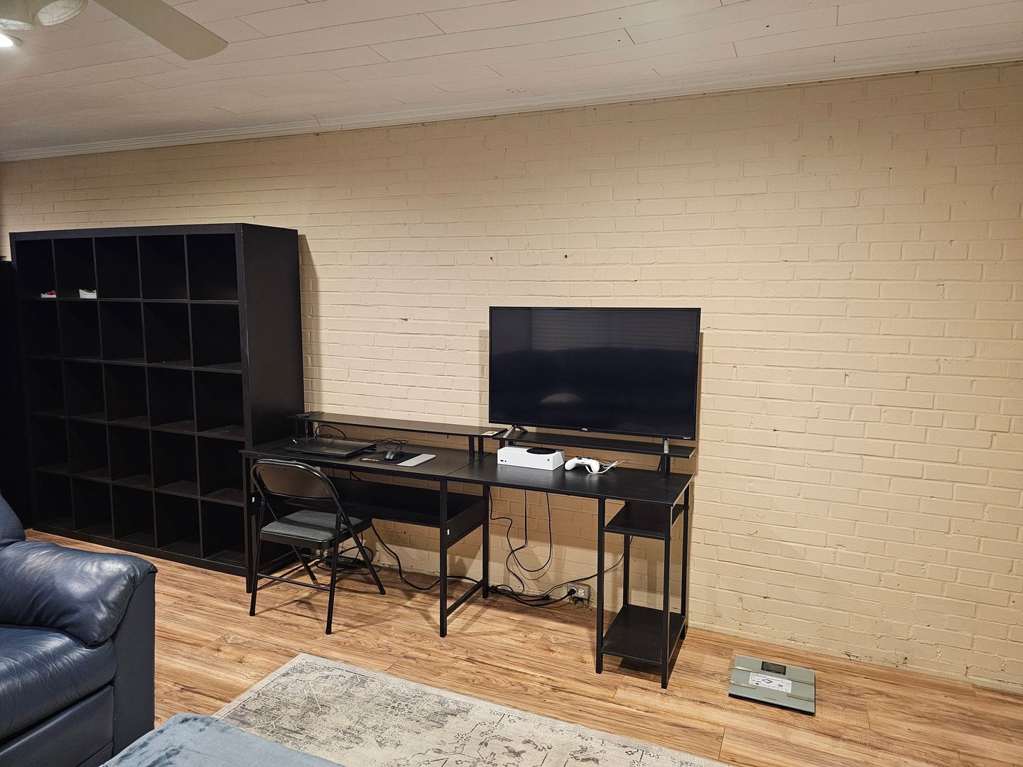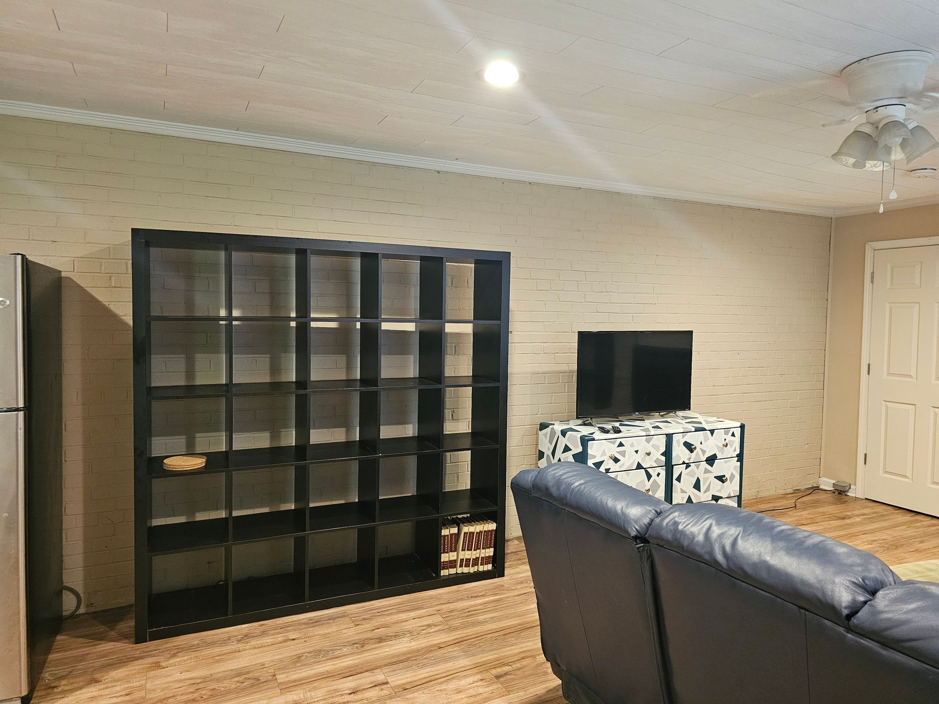 The living room has a large sofa with reclining seats, bookcase, desk and smart TV. It also has a ceiling fan with a mini-split for AC/Heat. The fireplace is decorative only. The utility room has a washer and dryer, utility sink and storage with an additional separate entrance to the apartment.