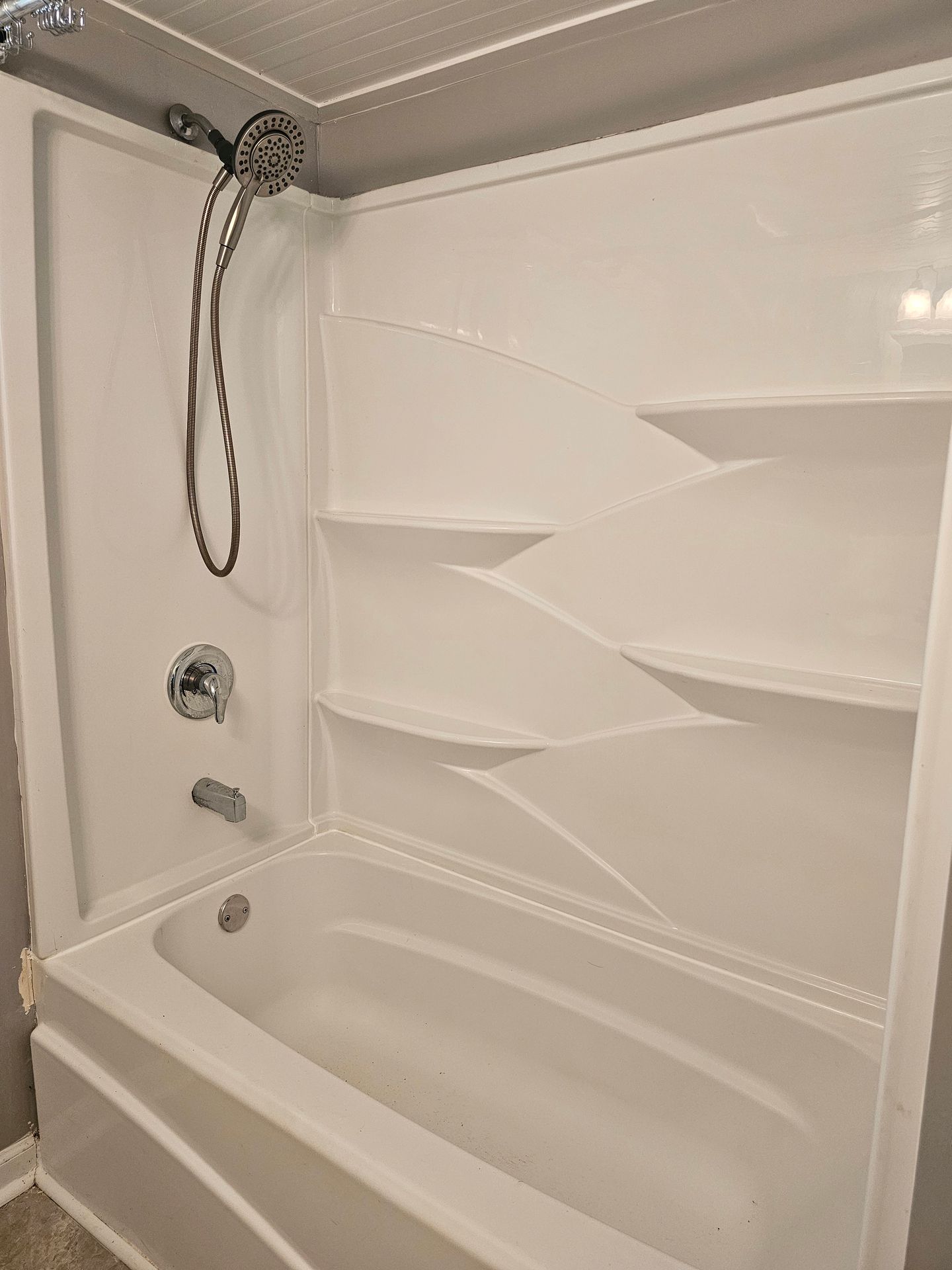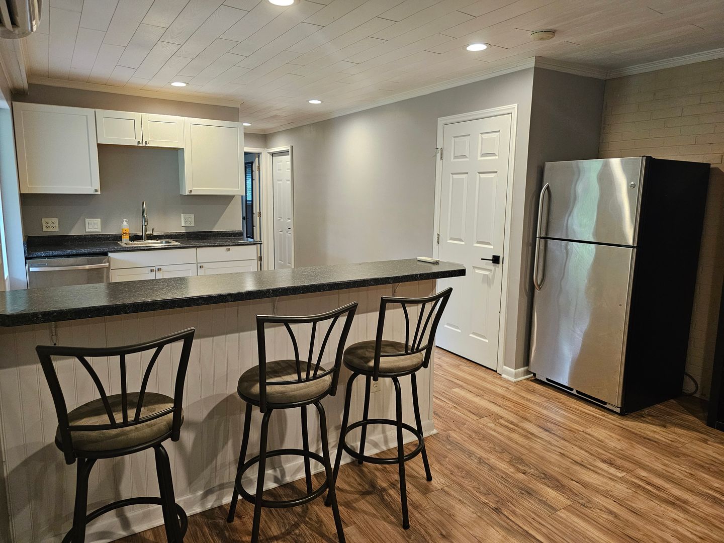 The bedroom has a queen bed, dresser, chest of drawers, a large closet, ceiling fan, and a mini-split for AC/Heat. The full bathroom has a tub/shower combo, toilet, and sink. The kitchen has a stove/oven, sink with disposal, dishwasher, refrigerator, and bar top with three bar stools. The kitchen includes a microwave, coffee maker, pots, pans, all dishes, cups, silverware, and cooking utensils.